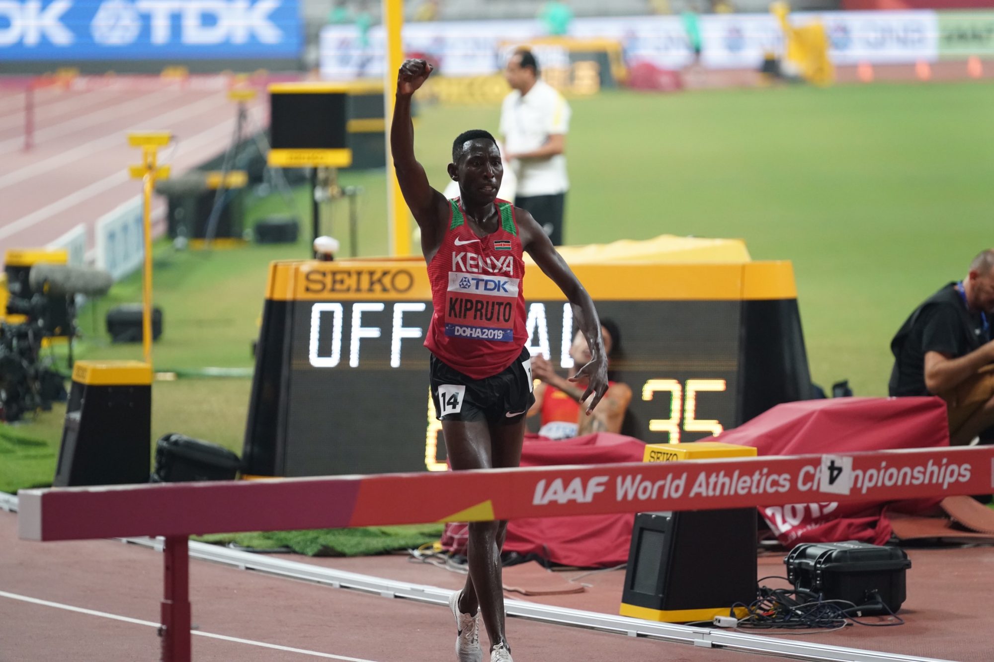 Kenya’s Conseslus Kipruto came from behind to snatch his second successive world title on the finish line in the men’s 3000m steeplechase at Doha 2019 World Athletics Championships./ Photo credit: Getty Images for IAAF